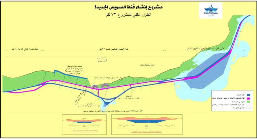 طول قناة السويس الأصلية التي افتُتحت عام 1869 هو 193 كم، وقد أُنشئت القناة الجديدة بحسب الموقع الرسمي لهيئة قناة السويس، كفرع موازٍ يخرج من القناة الرئيسية عند الكيلومتر رقم 60، ويصب فيها مجددا في الكيلومتر رقم 95 (أي تمتد القناة الجديدة على طول 35 كم في موازاة القناة الأساسية) بحيث يفصل بينهما جزيرة يخطط مستقبلا لمشاريع استثمارية فيها.