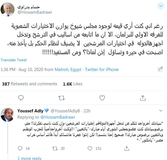 وكتب د.حسام بداروي عبر حسابه “@HossamBadrawi” تغريدة ما زالت موجودة ضمن حسابه قال فيها “رغم أني كنت أرى قيمة لوجود مجلس شيوخ يوازن الاختيارات الشعبوية للغرفه الأولى للبرلمان، إلا أن ما أتابعه من أساليب في الترشح وتدخل أجهزة الدولة في اختيارات المرشحين لا يضيف لنظام الحكم بل يأخذ منه، أصبحت في حيرة وتساؤل إذن لماذا؟ ومن المستفيد!!!!!!”.
