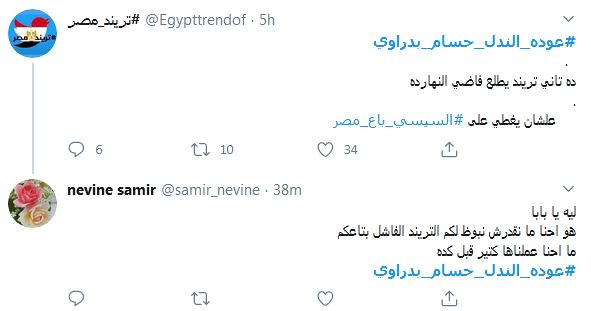 واعتبر الإعلامي هيثم أبو خليل أن الهاشتاج عقاب لبدراوي قائلا: “بيتم جلد الدكتور حسام بدراوي عن طريق الذباب الإلكتروني علشان كتب 7سطور ينتقد مجلس الأنس الجديد!! #مجلس_الشيوخ #السيسي_باع_مصر #عوده_الندل_حسام_بدراوي”.
