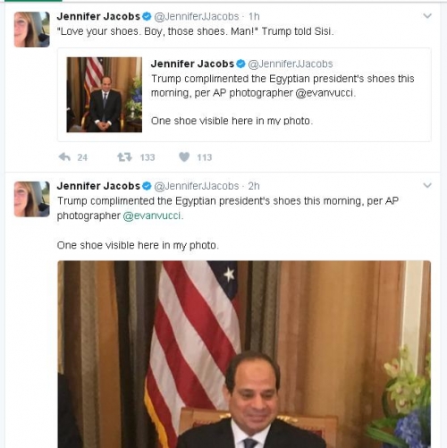 فى واحدة ضمن توابع التبعية والرضوخ للعم سام،واستمرار للحفاظ على كرسيه المسروق من الشرعية، كشفت الصحفية جينفر جاكوبز والمصور هو ايفان فوتشي بوكالة اسوسيتدبرس الأمريكية، إن الرئيس الأمريكى دونالد ترامب أعجب بحذاء المنقلب السيسى واصفاً إياه بـ”الولد” .
