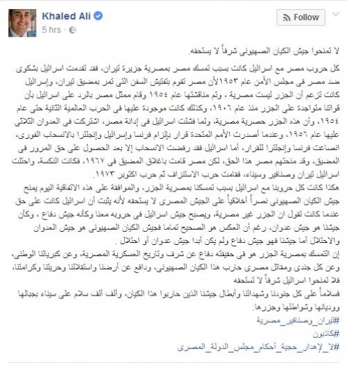 خالد علي: لا تمنحوا إسرائيل شرفًا لا تستحقه في”تيران”!