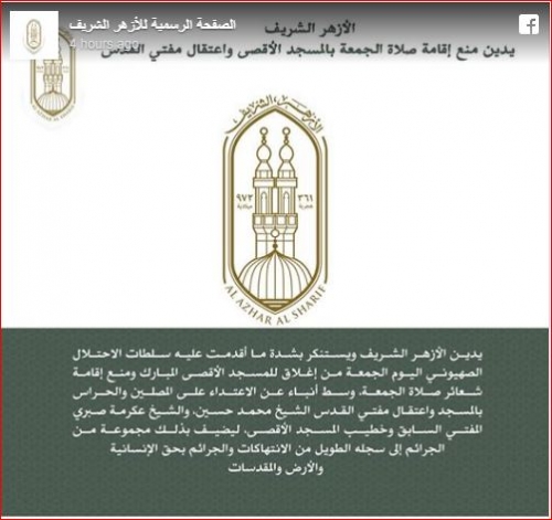 وقال بيان الأزهر الرسمي إنه “يدين… ويستنكر بشدة ما أقدمت عليه سلطات الاحتلال الصهيوني، اليوم الجمعة، من إغلاق للمسجد الأقصى المبارك ومنع إقامة شعائر صلاة الجمعة، وسط أنباء عن الاعتداء على المصلين والحراس بالمسجد، واعتقال مفتي القدس الشيخ محمد حسين، والشيخ عكرمة صبري المفتي السابق وخطيب المسجد الأقصى، ليضيف بذلك مجموعة من الجرائم إلى سجله الطويل من الانتهاكات والجرائم بحق الإنسانية والأرض والمقدسات”.