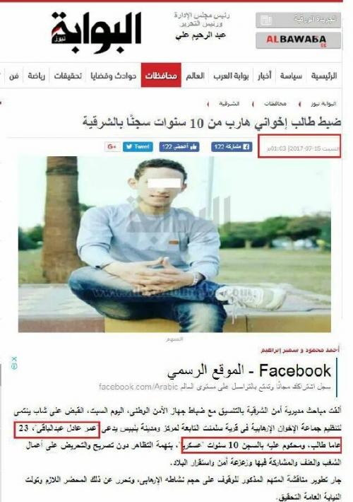 فقبل أسبوع من إعلان الداخلية اغتياله، نشرت “البوابة نيوز” توثّيقا لاعتقال الشهيد عمر عبدالباقى، وتحت عنوان “ضبط طالب إخواني هارب من 10 سنوات سجنًا بالشرقية” كتب الصحفيان أحمد محمود وسمير إبراهيم الخبر في 15 يوليو الجاري، وقالا إن “مباحث مديرية أمن الشرقية بالتنسيق مع ضباط جهاز الأمن الوطنى، ألقيا اليوم السبت، القبض على شاب ينتمى لتنظيم جماعة الإخوان فى قرية سلمنت التابعة لمركز ومدينة بلبيس يدعى “عمر عادل عبدالباقى”، 23 عاما طالب، ومحكوم عليه بالسجن 10 سنوات “عسكريا”، بتهمة التظاهر دون تصريح والتحريض على أعمال الشغب والعنف والمشاركة فيها وزعزعة أمن واستقرار البلاد.. وأنه جار تطوير مناقشة المتهم المذكور للوقوف على حجم نشاطه الإرهابى، وتحرر عن ذلك المحضر اللازم وتولت النيابة العامة التحقيق”.