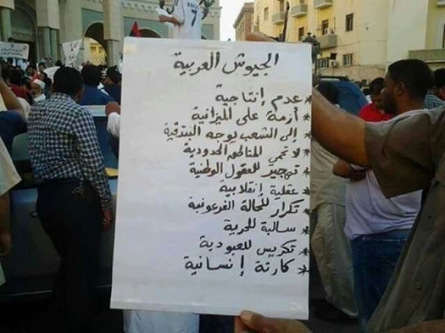 وأضافت اللافتة في تلخيص حال الجيوش العربية، أن هذه الجيوش تمثل أزمة على الميزانية، بعد أن نهبت هذه الجيوش ميزانية شعوبها بزعم الحفاظ على الأمن القومي، في الوقت الذي قامت فيه هذه الجيوش باستغلال هذه الميزانيات بإنشاء نوادي ترفيهية ومشروعات استثمارية تعود على قيادات هذه الجيوش فقط، وليس في تسليح المؤسسة العسكرية، وتطوير إمكاناتها.