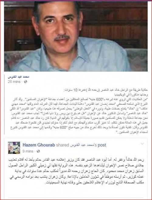 وأضاف “عبد القدوس” نجل الكاتب الصحفي والروائي إحسان عبدالقدوس “وجدتها مذكورة في الويكيبيديا “من الحكايات التي تروي عنه تبرعه بـ”600 جنيه” لصالح المعتقلين من أعضاء جماعة “الإخوان المسلمين”.. وقد أثار التبرع الذي تسلمه الصحفي “محمد إحسان عبد القدوس” دهشة قيادات الجماعة، فيما قال المرشد العام وقتها “محمد مهدي عاكف” إن “خالد” يتمتع بصفات طيبة، ودوره في “العمل الوطنى” يجعل تصرفه هذا طبيعيا، وكان “عبد القدوس” قد التقى “خالد عبد الناصر” وتساءل الدكتور خالد عن الإخوان “هل هم بتوع دين وبس..ولا دنيا كمان؟” أجاب محمد عبد القدوس: نحن جماعة شاملة ولا يمكن للمسلمين تقديم صورة جميلة للإسلام إلا بتفوقهم في الدنيا! كان رد خالد عبد الناصر: ده كلام جميل في هذه الحالة ممكن نتكلم، أنا عايز أقرب منكم وأفهمكم مع العلم أنكم إذا حاولتم تجنيدى فلن تفلحوا! ضحك عبد القدوس وقال: كفاية نكون أصدقاء! وبعد ذلك أخرج خالد من جيبه مبلغ “600 جنيه” وقدمها إلى محمد عبد القدوس كتبرع لسجناء الإخوان المسلمين..”.
