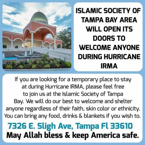 وفي مدينة تامبا، إحدى مدن ولاية فلوريدا التي اجتاحها إعصار إرما، فتح المركز الإسلامى طيلة الأيام القليلة الماضية، أبواب مسجده لإيواء المتضررين من الإعصار.