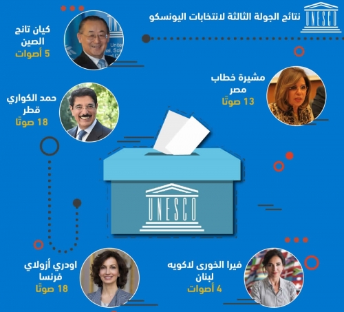أودريه أزولاى «فرنسا»:18 صوتا، كيان تانج «الصين»: 5 أصوات، فيرا خوري لاكويه «لبنان»: 4 أصوات، حمد الكواري «قطر»: 18 صوتا، مشيرة خطاب «مصر»: 13صوتا.