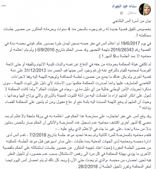 وأضافت عبد الجواد أن “أنس تقدم لدى ادارة محبسه ومحاميه لدى الجهات المعنية بعدة طلبات -على مدار اسبوعين قبل موعد الجلسة – لتمكينه من حضور الجلسة المقررة والتي جرت العادة علي تغييبه عن حضور جلسات استشكاله على الحكم بالقضية الأخرى ما يؤدي بهيئة المحكمة في كل مرة الى رفض الاستشكال بسبب عدم حضوره أو تأجيل النظر فيه لحين احضاره من محبسه”، مشيرة الي أنه وبعد كل ذلك لم يتم احضار أنس ايضا لمقر المحكمة وتقرر تأجيل الجلسة ل 28/2/2018 .