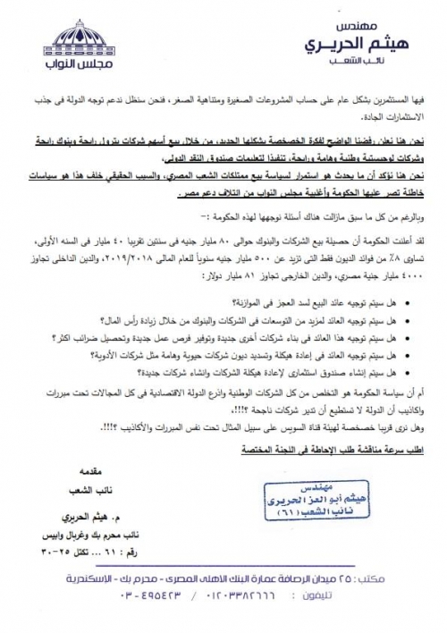 وقال” الحريرى “عبر صفحته بفيس بوك،اليوم الثلاثاء، إستنادا إلى حكم المادة (134) من الدستور، والمادة (212) من اللائحة الداخلية للمجلس، أتقدم بطلب الإحاطة التالى لكلا من رئيس مجلس الوزراء ووزير المالية،بشأن بيع أسهم عدد من الشركات والبنوك فى البورصة المصرية تنفيذا لاتفاقية صندوق النقد الدولي.