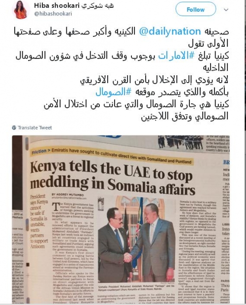 تداول ناشطون صوماليون عبر الإنترنت، صورة لافتتاحية صحيفة “ديلي نيشن” الكينية، توضح رفض كينيا الدور الإماراتي العابث في الصومال.