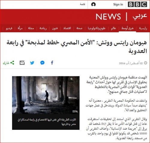 و طالبت “المنظمة” مجلس الأمن بتشكيل لجنة دولية للتحقيق في مجزرة رابعة والنهضة، وقالت إن الولايات المتحدة وأوروبا عادتا للتعامل مع الحكومة المصرية “التي تحتفل بقتل المتظاهرين”، بدلا من أن تحقق في ما اعتبرت المنظمة أنه قد يكون أسوأ جريمة قتل في يوم واحد للمتظاهرين في التاريخ الحديث.