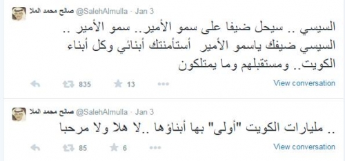 وكان الملا قد كتب- في تغريدات أطلقها- “السيسي لا هلا ولا مرحبا.. أهل الكويت أولى بملياراته”، وأضاف: “السيسي .. سيحل ضيفا على سمو الأمير.. سمو الأمير.. السيسي ضيفك يا سمو الأمير استأمنتك أبنائي وكل أبناء الكويت.. ومستقبلهم وما يمتلكون”.