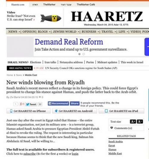 “هآرتس” قالت “إنه بعد يوم من قرار محكمة في مصر باعتبار حماس كلها وليس فقط جناحها العسكري تنظيما إرهابيا، توجهت حماس للسعودية للضغط على الرئيس المصري عبد الفتاح السيسي لإلغاء القرار. هذا التوجه يثير الاهتمام؛ لأن حماس تعتقد أن الملك السعودي الجديد سلمان سوف يمنح أذنا صاغية للتنظيم التابع للإخوان المسلمين، المصنفين في السعودية نفسها كجماعة إرهابية”.
