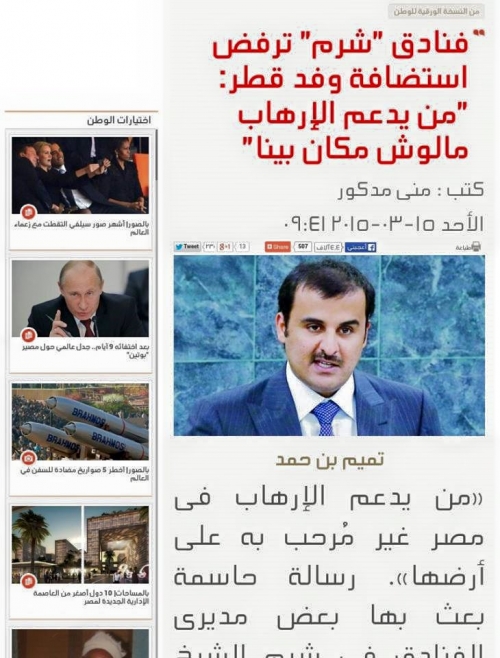 فبركت صحيفة الوطن المحلية المصرية خبرًا يفيد بامتناع الفنادق الراعية لمؤتمر شرم الشيخ الاقتصادي عن استقبال الوفد غير الحكومي القطري المشارك في المؤتمر.