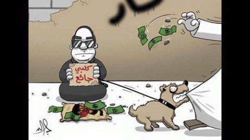 ورغم أن “الخليجي” يمنحه المال فإن الرسم يوضح أن “الكلب” مستمر في النباح، ومحاولة عقر الخليجي.