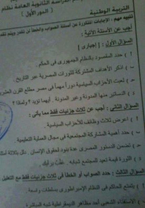 وتداول نشطاء مواقع التواصل الاجتماعى ورقة أسئلة امتحان “التربية الوطنية”، بعد نصف ساعة فقط من بدء لجنة الامتحان .