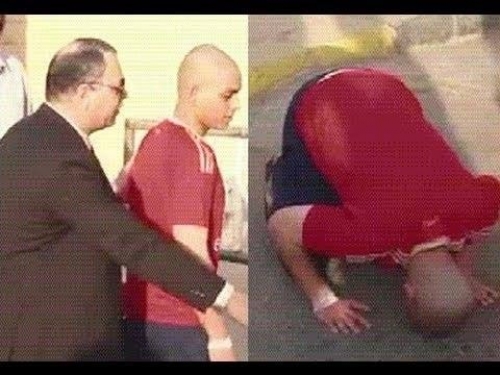خلف الكاميرات، وهم يطلبون منه أن يسجد شكرًا لقرار عفو عبد الفتاح السيسي عن شباب تم اعتقالهم بدعوى خرقهم لقانون التظاهر .