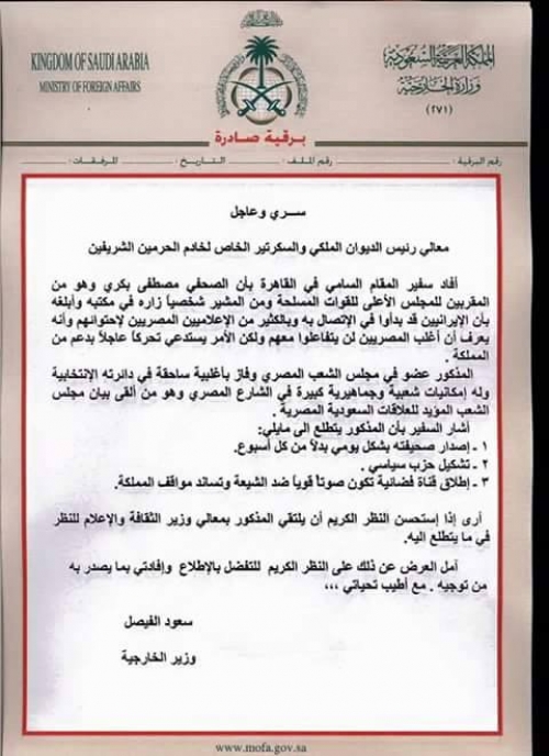 وفي مصر أيضا، تكشف برقية أخرى استياء المملكة من استضافة قناة ontv للمعارض السعودي سعد الفقيه، فيما يبدو ابتزازا للسعودية، وتقول البرقية “أفاد سفير المقام السامي في القاهرة أنه قام بالاتصال بالسيد نجيب ساويرس، “مالك المحطة” في حينه، وعاتبه على ما حدث، ووعد السفير باتخاذ اللازم بعدم تكرار هذا الأمر، كما قام السفير بالاتصال بالسيد/ البير شفيق، المشرف العام على المحطة، عن طريق الدكتور مصطفى الفقي، وهو صديق حميم له، والذي أيضا عاتبه بشدة على ما حدث، وقد قام معالي السفير بشرح حقيقة سعد الفقيه وماضيه، وأخبره بأن المملكة لا تنزعج من الانتقاد البناء، ولكن التجريح والسب أمر غير مقبول، وقد أعرب السفير له عن استيائه من انحياز مذيعة المحطة لموقف الفقيه، وقد قام السيد نجيب ساويرس بالاتصال بمشرف عام المحطة، وعاتبه لما حدث وطلب منه عدم استضافة سعد الفقيه مرة أخرى”.