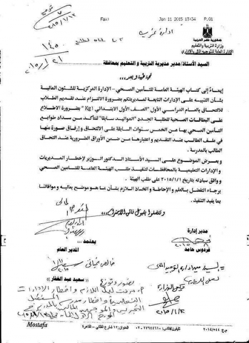 حصلت “وراء الأحداث” على وثيقة تكشف تحول وزارة التربية والتعليم إلى فرع لوزارة المالية بإصدار منشور وزاري يشترط تحصيل رسوم التأمين الصحي، من الطلاب الجدد بالمدارس لصالح وزارة الصحة قبل قبول ملفاتهم.