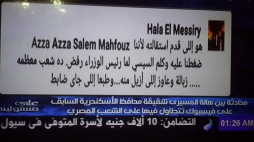وقد أظهر النشطاء رسالة من “هالى المسيرى” شقيقة الإنقلابى المقال هانى المسيرى محافظ الإسكندرية، حيث قالت :إانهم ضغطوا على “المسيرى” لتقديم استقالته بعد الشلل الذى أصاب المحافظة وقاموا بالتواصل مع رئيس وزراء الإنقلاب شريف إسماعيل لقبولها.