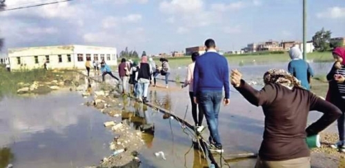 وقف عشرات الطلاب فى حالة صدمة، يحاولون وضع الخطط لتجاوز الأرض الغارقة بمياه الأمطار، للوصول للجنة، ولم يجدوا حلاً إلا صنع «معدية» من المواسير وألواح الخشب، ليمروا عليها بطريقة «حبل السيرك».
