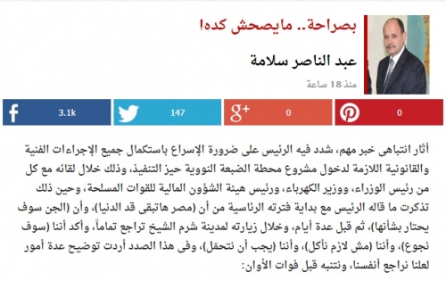 كما انتقد سعي مصر لبناء مفاعل نووي في وقت تتخلى الدول عن هذه المفاعلات لخطرها، وتفشل مصر في التعامل مع مشكلة الأمطار لا مشاكل المفاعلات، وبالمقابل تجاهل استغلال الطاقة الشمسية باعتبارها الطاقة الأوفر، والأنقى، والأنسب لمجتمعنا.