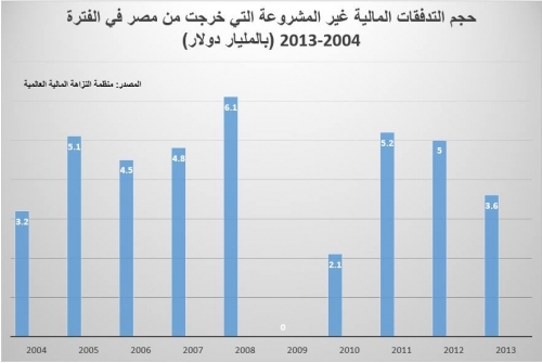 وقدر تقرير التحويلات المالية غير المشروعة، الذي أطلقته منظمة النزاهة المالية، حجم الأموال التي خرجت من مصر بصورة غير مشروعة بدقة بنحو 39.8 مليار دولار خلال الفترة من 2004-2013.