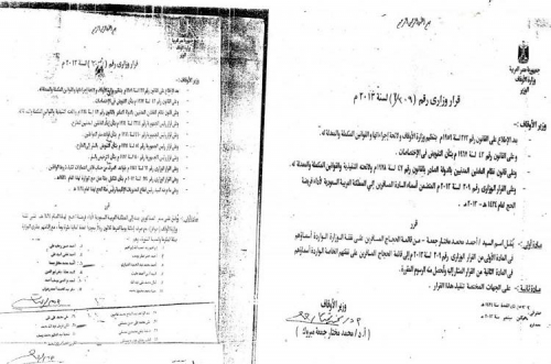 ينص القرار على: أنه بعد الاطلاع على القانون رقم 122 لسنة 1951 بشأن وزارة الأوقاف ولائحتها المنظمة لها وعلى القانون رقم 42 لسنة 1967 بشأن التفويض في الاختصاصات وعلى نظام العاملين المدنين بالدولة بالقانون رقم 42 لسنة 1928 وعلى مجموعة قوانين أخرى منها على القرار الوزاري رقم 274 لسنة 2013 بشأن تشكيل بعثة عمل حج الوزارة للعام الهجري 1434 .