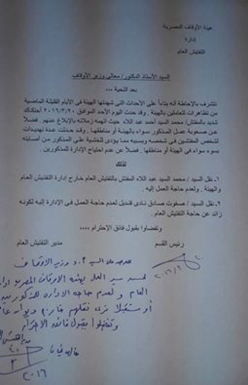 قام موظفو هيئة الأوقاف ، أمس ، بإرسال مذكرة إلى وزير الأوقاف، بأنهم قاموا بنقل المفتش محمد السيد أحمد، وصفوت صادق قنديل، عقب الإحتكاك الشديد بينهم وبين زملائهم بالفترة العصيبة الأخيرة التي شهدتها هيئة الأوقاف .