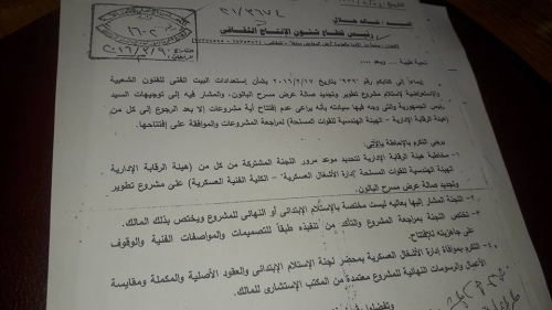 حصل “وراء الأحداث ” على وثيقة تكشف أن زعيم عصابة الانقلاب عبد الفتاح السيسى ، أمر بعد تنفيذ أى مشروعات أو تجديدات أو صيانة فى مبانى الوزارات وجميع الهيئات التابعة لها أو تسلمها من الجهات القائمة بالمشروعات إلا عن طريق الجيش ممثلا فى الهيئة الهندسية بالقوات المسلحة . وتؤكد الوثيقة الواردة برقم 1602 بتاريخ 9 مارس 2016 لرئيس قطاع الأنتاج الثقافى للبيت الفنى للمسرح ، الخاصة بتجديد مسرح البالون بالعجورة ، على حظر القيام بأى أعمال إلا من خلال الهيئة الهندسية بالقوات المسلحة ، بناء على تعليمات مايسمى رئيس الجمهورية ، لكى تتم الموافقة على أى مشروعات أو افتتاحها ، مؤكدة أن هذا القرار يطبق على جميع وزارات وهيئات مصر . فيما أكد مراقبون أن إجبار زعيم عصابة الانقلاب لجميع وزرات وهيئات مصر ، على أن يكون الجيش هو الهيئة الوحيدة فى مصر التى تسيطر على جميع مشروعات الإنشاءات والصيانة والتجديد ، حتى لو كانت دورة مياه ،يفتح أبواب كبيرة للفساد ، ويسمح للمسئوليين بالهيئة بالحصول على روشاوى وعمولات من الشركات ، فضلا على إهدار المال العام .