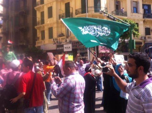 وتداول نشطاء موقع “تويتر” صور لمؤيدي قائد الانقلاب وهم يرفعون صوره وأعلام السعودية، في الوقت الذي اتهموا فيه من قبل المتظاهرين في ثورة يناير بالخيانة للسعودية حينما رفعوا أعلام مكتوب عليها لا إله إلا اله وليست اعلام السعودية.