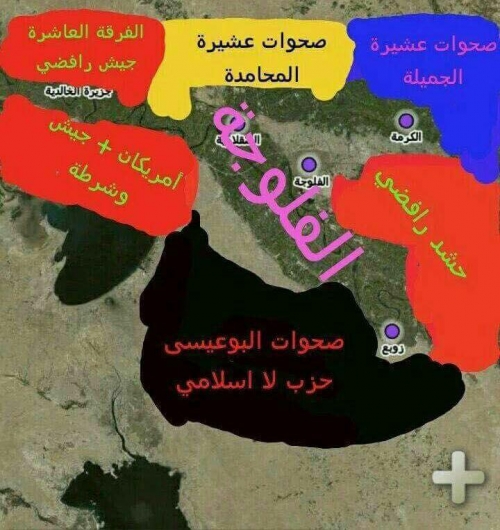 2- كل العمليات بإشراف تام من الامريكان ولا تتحرك اي قطعة عسكرية بدون اذنهم حيث تحرك قبل يومين قطعات من الحشد الشيعي في الكرمة فقام الطيران الامريكي بقصفهم، وقبل يومين تحركت قوات كبيرة من الحشد من محافظة كربلاء باتجاه عامرية الفلوجة أرادوا الدخول بالقوة لكن شيوخ عشائر البوعيسى رفضوا ذلك واتصلوا بالطيران الأمريكي مما أدى إلى تراجعهم والعودة إلى كربلاء بعد أن رأوا تحليق الطيران الأمريكي فوقهم.