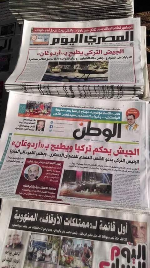 وجاءت مانشيتات صفح الانقلاب في مصر وعلى رأسها “الوطن” و”المصري اليوم” و”اليوم السابع” تهنئ الشعب التركي بنجاح انقلاب الجيش التركي، رغم فشله، ما يظهر تعجل إعلام الانقلاب في مصر بنتيجة الانقلاب في تركيا ومشاركتهم في الحرب الإعلامية المستعرة على الرئيس التركي رجب طيب أردوغان.