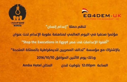 أعلنت حملة “إعدام إنسان” تنظيم مؤتمر صحفي في لندن بالتعاون مع منظمة “تحالف المصريين للديمقراطية ببريطانيا” ، ظهر غد الاثنين ، 10 اكتوبر 2016 ، بعنوان “أوقفوا الإعدامات في مصر” ؛ وذلك بالتزامن مع اليوم العالمي لمناهضة عقوبة الإعدام