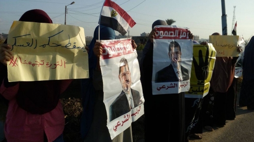 لافتات التنديد بجرائم الانقلاب وغلاء الأسعار وتردى الأحوال رفعتها الحرائر، بجوار علم مصر وصور الرئيس محمد مرسى وشارات رابعة العدوية وصور الشهداء والمعتقلين.