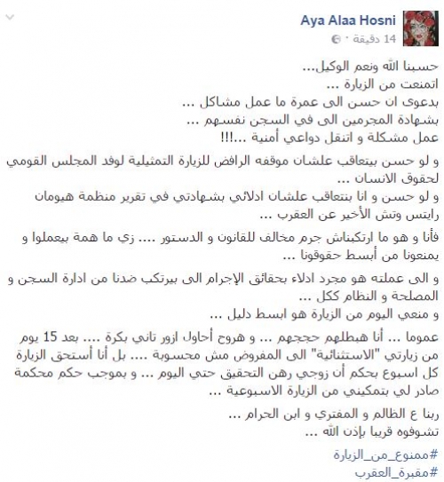وفى محاولة للتعرف على أسباب منع الزيارة ونقل زوجها تسائلت صاحبة القلم الحر “لو حسن بيتعاقب علشان موقفه الرافض للزيارة التمثيلية لوفد المجلس القومي لحقوق الإنسان.. ولو حسن وانا بنتعاقب علشان ادلائي بشهادتي في تقرير منظمة هيومان رايتس وتش الأخير عن العقرب.
