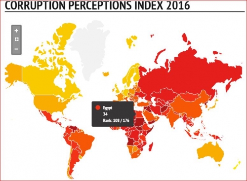 أحتلت مصر الترتيب رقم 9 بين 17 دولة عربية، فضلا عن ترتيبها 108 بين 176 دولة حول العالم، في قائمة مؤشر مدركات الفساد العالمي لعام 2016، الذي أصدرته منظمة الشفافية الدولية.