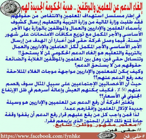 واعتبرت الحركة أن رفع الدعم عن المعلمين والإداريين هو وسيلة جديدة لإذلال المعلمين وإفقارهم عمدا، مطالبة بالوقوف وقفة جادة لمنع تمرير هذا المخطط الذي يزيد العاملين بالحقل التعليمي فقرا.