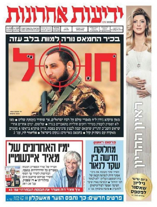 تصدر حادث اغتيال الشهيد مازن فقهاء في غزة، قائمة الموضوعات المهمة التي تحدث عنها الإعلام العبري (صحافة وإذاعة وقنوات)، منذ اغتياله.. فمن صحيفة “يديعوت أحرونوت” الأبرز عبريا، وضعت صورة في صدر الصفحة ألولى لإصدراها “التابلويد” لمازن فقهاء بزيه العسكري وحول وجهه دوائر الاستهداف بالأحمر.
