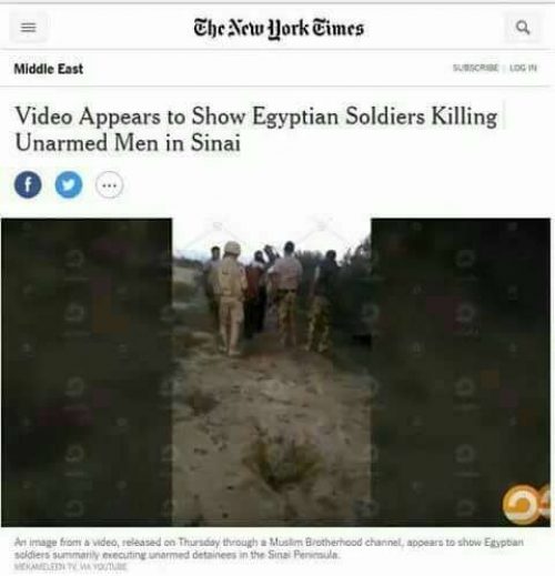 وتحدثت هيومن رايتش ووتش عن نشر فيديو مروع يُظهر جنودا مصريين يبدو أنهم يعدمون محتجزين اثنين على الأقل في شمال سيناء. بجانبهم على الأرض جثث عدة رجال آخرين جاثمة على وجوهها. ظهر الفيديو على قناة مكملين الفضائية المصرية المعارضة التي تبث من تركيا، ويعطي رواية مختلفة عن رواية الجيش المصري الذي يقول إن القتلى إرهابيون لقوا حتفهم بينما كانوا يحاربون الجيش.