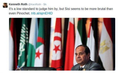 بدأت صحف ونشطاء أجانب حملة جديدة على الرئيس المصري المشير عبد الفتاح السيسي؛ الذي تولى الحكم عقب انقلاب عسكري، بعد وصفه بالديكتاتور، مشبهة إياه بالجنرال التشيلي الديكتاتور السابق أوجستو بينوشيه، ملمحة إلى أن السيسي أكثر وحشية من بينوشيه. ورأى كينيث روث المدير التنفيذي لمنظمة “هيومن رايتس ووتش” المعنية بالدفاع عن حقوق الإنسان…