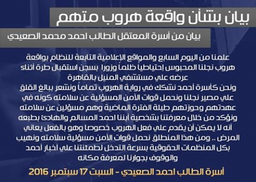 حملت أسر الطالب أحمد محمد الصعيدي، المعتقل بسجن استقبال طره، والذي أعلنت داخلية الانقلاب أمس هروبه من مستشفى المنيل الجامعي، سلطات الانقلاب المسؤولية الكاملة عن سلامته، وأهابت بكل المنظمات الحقوقية التدخل لطمأنتهم علي ابنهم أحمد، ومساعدتهم في معرفة مكانه. وقالت الأسرة- في بيان أصدرته مساء السبت-: إنها “علمت من…