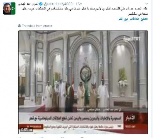 #قطع_العلاقات_مع_قطر والذى تصدر ترند مواقع التواصل الاجتماعى القصير “تويتر” اليوم الاثنين، وقد بدأت ملامح المخطط الأمريكى الصهيونى تظهر عقب القمة الإسلامية الأمريكية، التى أقيمت مؤخرا بالرياض، التى أظهرت الحقيقة للجميع وما اعقبها من تزييف وتزوير وفبركة لأحاديث قطرية،وماتلاها من تسريبات حقيقية للبريد الألكترونى لسفير الإمارات بالولايات المتحدة، فيما دشن مغردون…